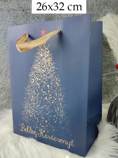 Karácsonyi dísztáska, kék, arany színben. Elegáns ajándéktáska férfiaknak és nőknek egyaránt. Boldog Karácsonyt felirattal. A táska nagy méretű így párnához, törölközőhöz és hasonló méretű termékekhez is ajánljuk.