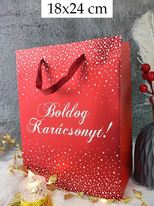 Boldog Karácsonyt dísztáska, karácsonyi feliratos dísztáska. A táska méret 18x24 cm, így kisebb ajándékokhoz ajánljuk, mint pl.: póló, bögre, kötény, hógömb és további hasnoló méretű termékek.