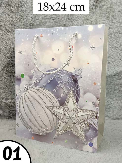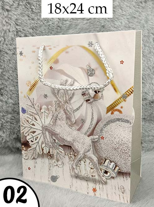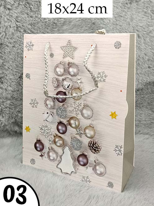Ajándéktáska karácsonyra, fehér csillámos. Három féle mintájú, igazi karácsonyi hangulatú dísztáska, visszafogott világos mintával, ami bármelyik korosztály számára tökéletes díszcsomagolást nyújt a karácsonyi ajándéknak. Bögrék, kulcstartók és kisebb méretű ajándéktárgyak mellé ajánljuk.