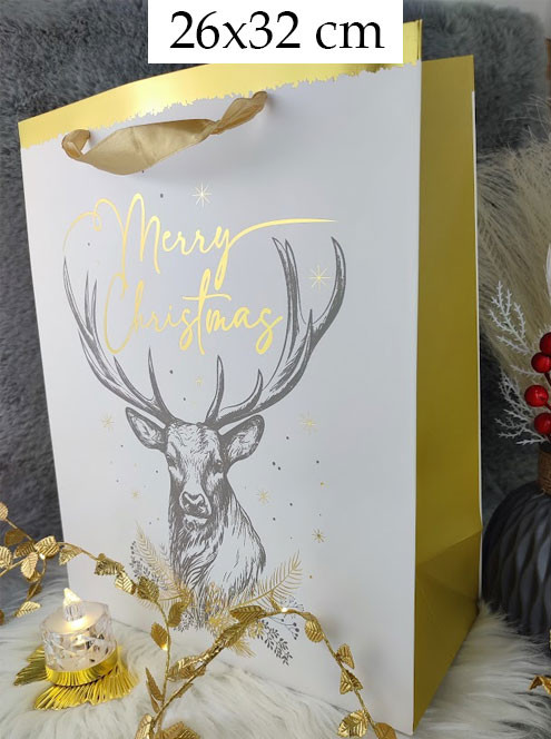 Karácsonyi ajándéktasak, szarvassal díszítve, merry christmass arany felirattal. Díszcsomagolás törölközőhöz, párnához. Nagyobb ajándéktárgyakhoz javasoljuk.