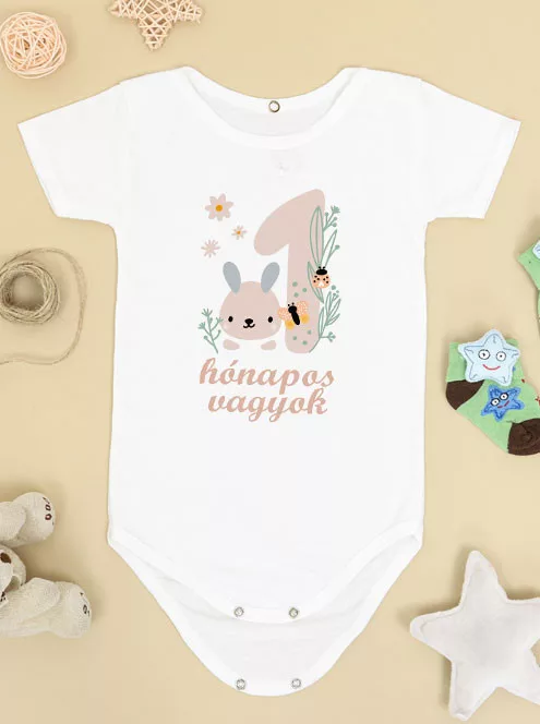 Az első hónap csodája megérdemel egy igazán különleges emléket – ez a nyuszis mintás, természetes stílusú body tökéletes meglepetés lehet minden kisbaba számára. A „1 hónapos vagyok” feliratos kombidressz nemcsak bájos ajándék, hanem kényelmes viselet is: rövid ujjú, hátul patentos kialakítású, és 100% pamut anyagból készült, így gyengéd a baba bőréhez.