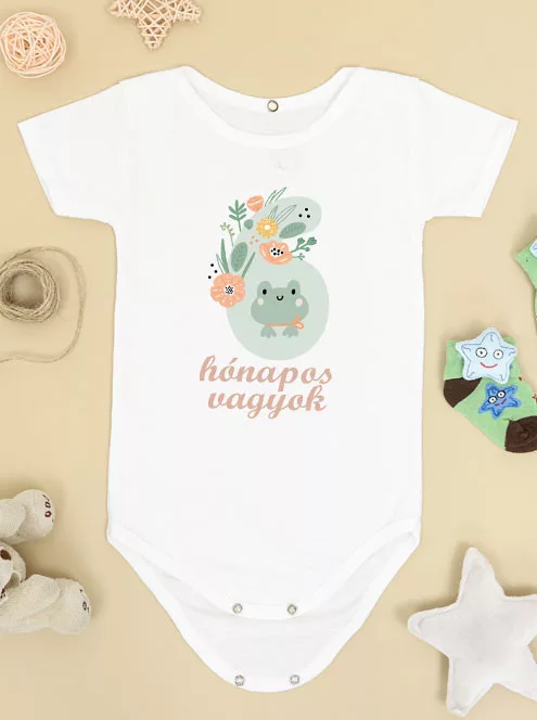 Ez az aranyos, békás mintával díszített body igazi mosolygós meglepetés egy 6 hónapos baba számára. A természetes stílusú, pasztellszínű dizájn tökéletesen illik egy egyedi feliratos ajándékhoz, amely emlékezetes marad. A kombidressz 100% pamutból készült, hátul patentos és rövid ujjú – így kényelmes és praktikus viselet a babának, miközben különlegessé teszi a havi fotókat.