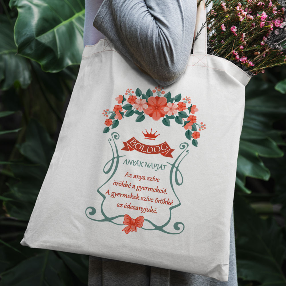Anyák napi ajándék, anya szíve örökké táska. Kedves idézettel, kedves ajándék édesanyáknak. "Az anya szíve örökké a gyermekeié. A gyermekek szíve örökké édesanyjuké." Anyák napján köszöntsd édesanyádat ezzel az idézetes vászontáskával. Választható dísztáskának, de bevásárló táskának is praktikus.