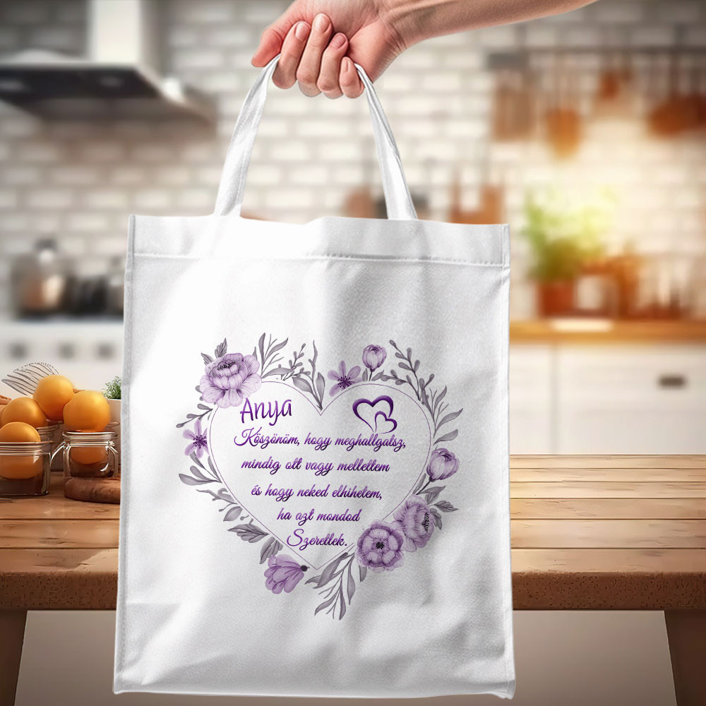 Egyedi idézetes vászontáska, köszönöm anya. Személyes ajándék Édesanyáknak anyák napjára, születésnapra vagy bármilyen különleges alkalomra! Ez az egyedi vászontáska szív alakú keretbe foglalt, szívhez szóló idézettel és gyönyörű lila virágmintával készült. Kiváló választás, ha szeretnéd kifejezni háládát és szeretetedet anyukád felé.