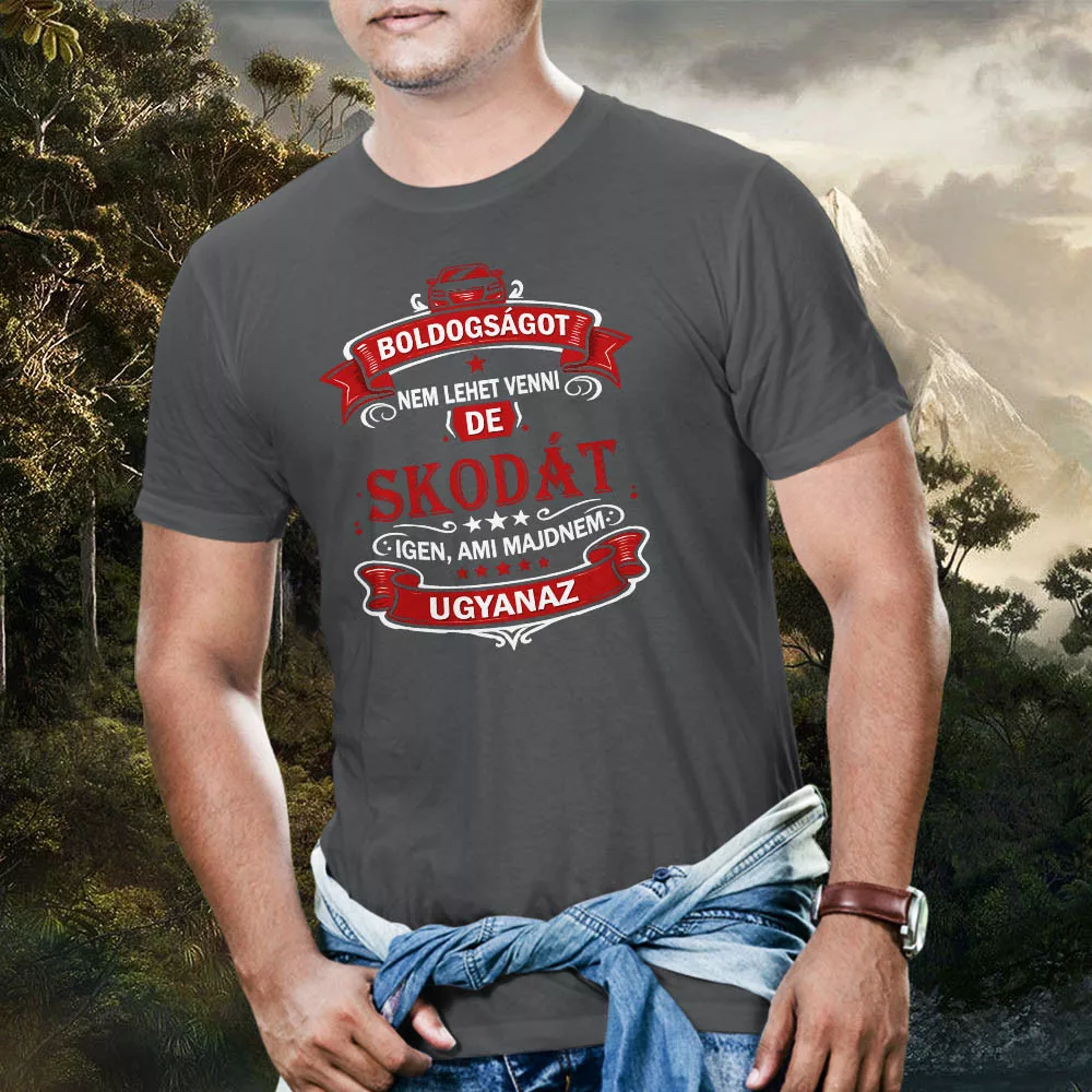 Skodás férfi póló, boldogságot nem lehet venni. Autós rajongóknak szánt, figyelemfelkeltő ajándéktárgy, amely a „Boldogságot nem lehet venni, de Skodát igen, ami majdnem ugyanaz” felirattal és a karakteres grafikával rögtön mosolyt csal az arcokra. A Skodás férfi póló tökéletes választás lehet születésnapra, névnapra, karácsonyra, apák napjára vagy bármilyen alkalomra, amikor egy személyes, autós ajándékkal szeretnél örömet szerezni.