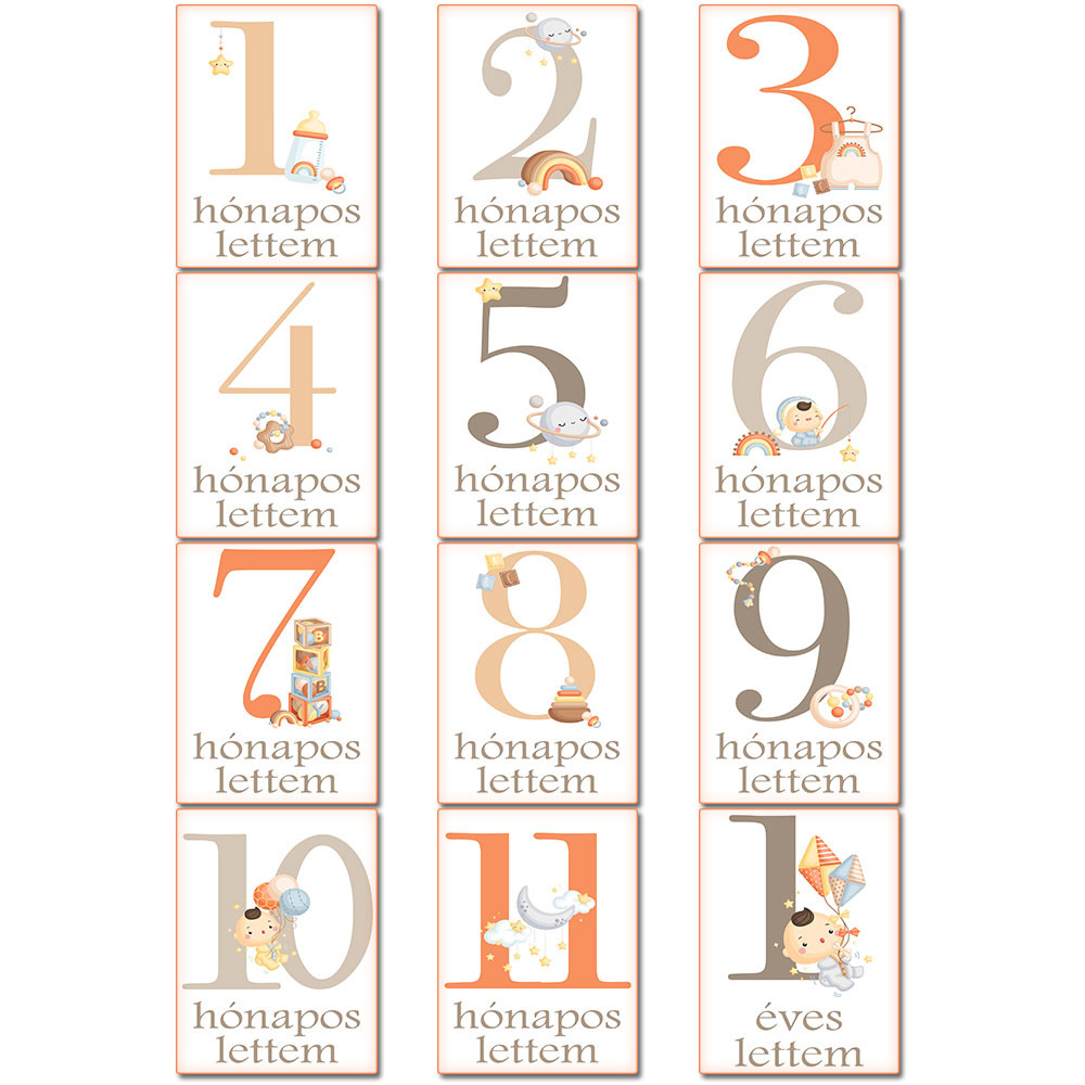 Baba mérföldkő kártya, baba játékos kártya. 12 darab kártya hónapokra bontva a babák kedvenc játékaival díszítve. Készíts egyedi fotókat hónapról-hónapra kisbabád fejlődéséről, ilyen cuki kártyák segítségével. Babaváró vagy babaköszöntő ajándéknak, keresztelőre is tökéletes választás. Kiváló kiegészítő a babaköszöntő plüssök mellé.