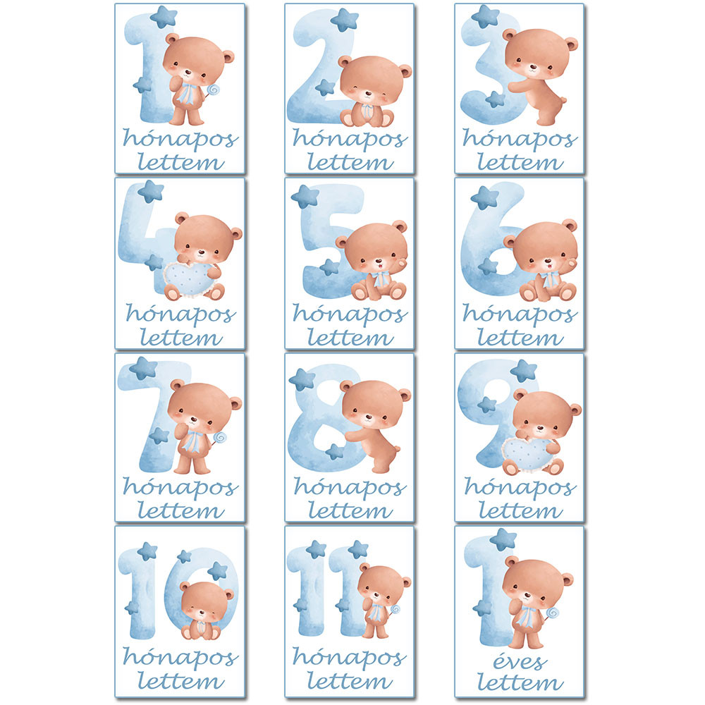 Fiús baba mérföldkő kártyák, macis. 12 darab kártya hónapokra bontva macikkal. Készíts egyedi fotókat hónapról-hónapra kisbabád fejlődéséről, ilyen cuki kártyák segítségével. Babaváró vagy babaköszöntő ajándéknak, keresztelőre is tökéletes választás. Kiváló kiegészítő a baba emlékörző plüssök mellé.