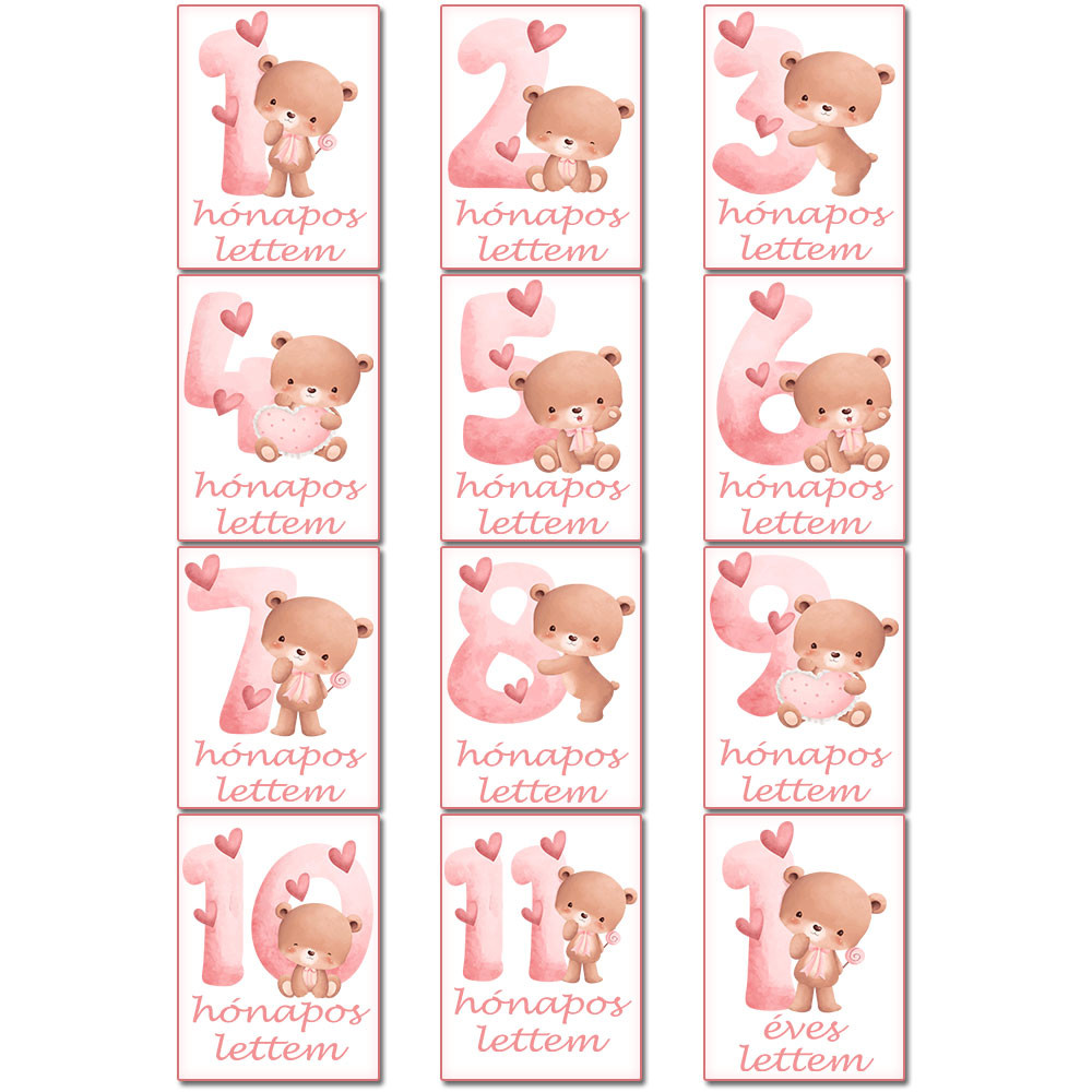 Lányos baba mérföldkő kártyák, macis. 12 darab kártya hónapokra bontva cuki macikkal. Készíts egyedi fotókat hónapról-hónapra kisbabád fejlődéséről, ilyen cuki kártyák segítségével. Babaváró vagy babaköszöntő ajándéknak, keresztelőre is tökéletes választás. Kiváló kiegészítő a baba emlékörző plüssök mellé.