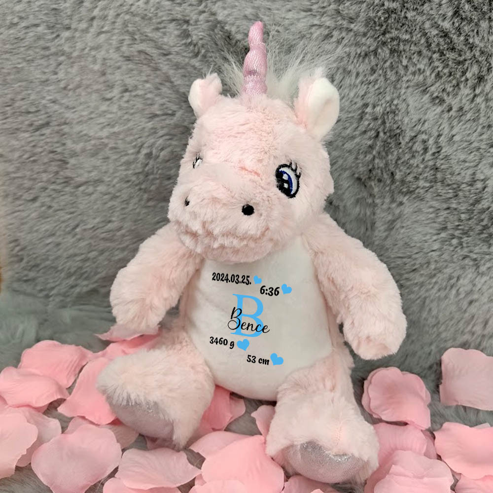 Baba emlékőrző ajándék, plüss unikornis. Aranyos plüss rózsaszín unikornis újszülött kisbabáknak, szülőknek. Kiváló ajándék, mely a kisbaba adataival örök emlékként és kedvenc plüssfiguraként is tökéletes névre szólóan minden gyereknek.