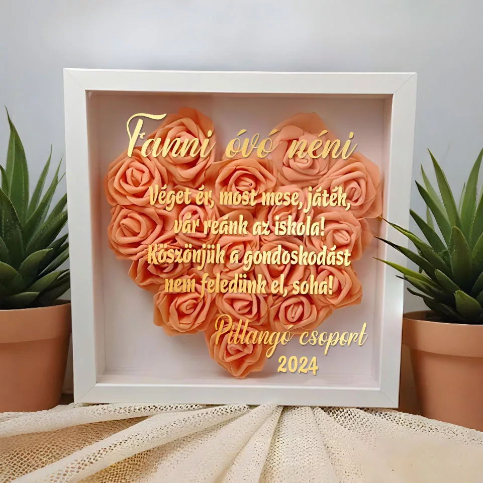 Ballagási 3D virágos képkeret óvó néninek. Elköszönő ajándék óvónőnek ballagásra. Köszönjétek meg Ti is a többéves munkát óvónéniteknek egy különleges faliképpel. 3D falikép idézettel és rózsákkal Óvó néniknek ballagásra. Rendeléskor töltsd ki az óvónő nevét és a nevedet vagy ballagó csoport megnevezését, és az évszámot, időszakot. Garantáltan egyedi ajándékkal tudtok majd búcsúzni kedvenc Óvó nénitektől. Képkeret narancssárga rózsákkal szív alakban kirakva és arany színű felirattal.