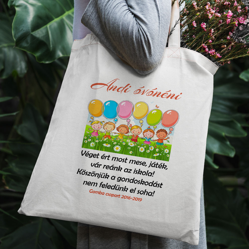 Táska óvónéninek, ovis ballagás ajándék. A vászontáska kérhető egyedi névvel, csoporttal és évszámmal. Rendeléskor töltsd ki az Óvónéni nevét, a Ballagó csoport megnevezését, és az évszámot, időszakot. Garantáltan egyedi ajándékkal tudtok búcsúzni kedvenc óvónénitektől.