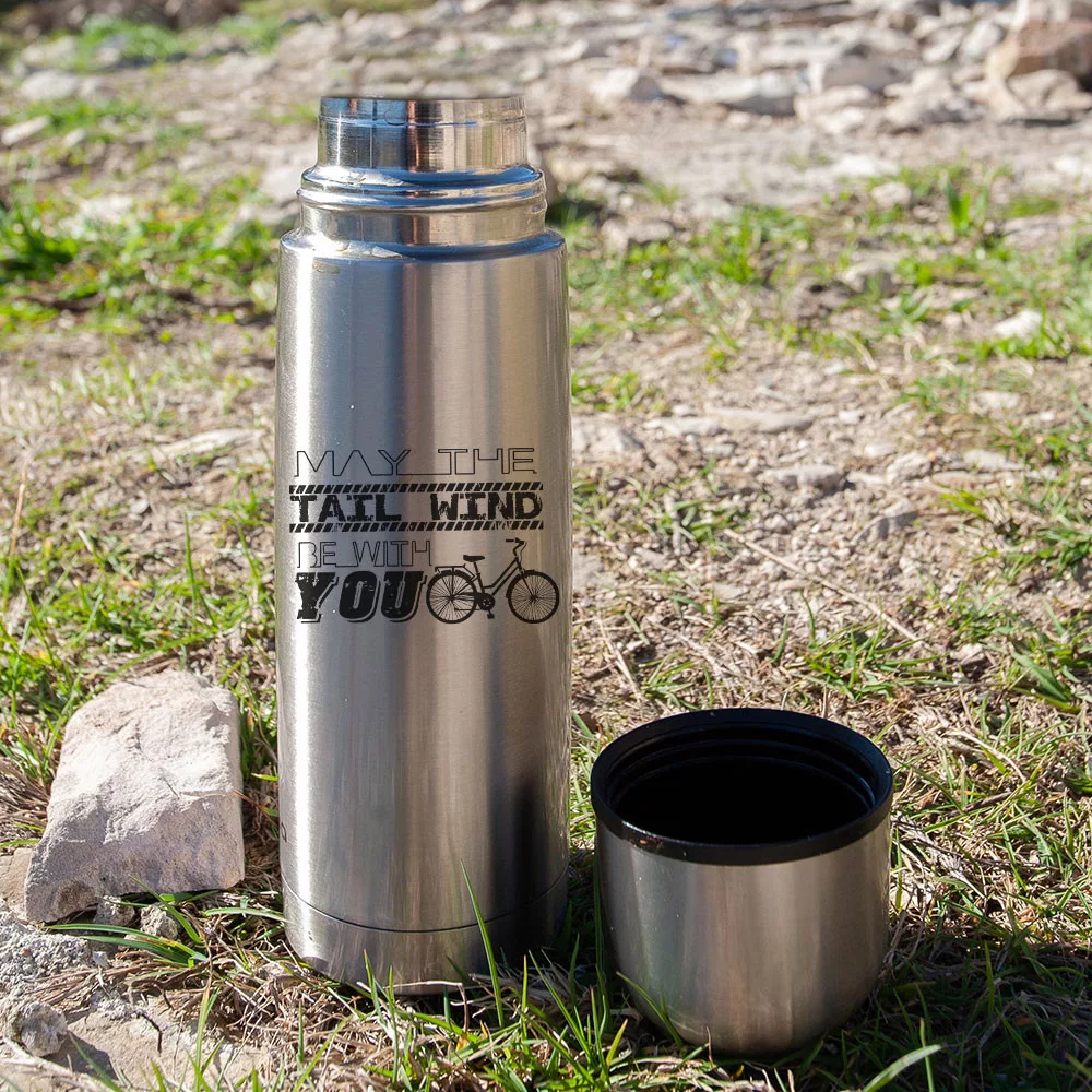 Ajándék bicikliseknek, kerékpáros termoszok. Tökéletes meglepetés bringásoknak. "May the tailwind be with you" felirattal ellátva. Jelentése: "a hátszél legyen veled". Vicces ajándék biciklis nőknek és férfiaknak névnapra, születésnapra.