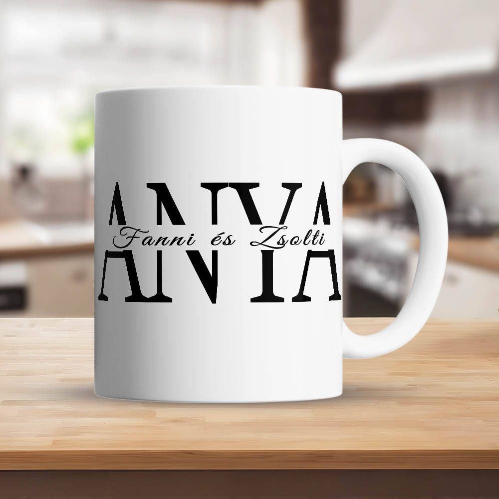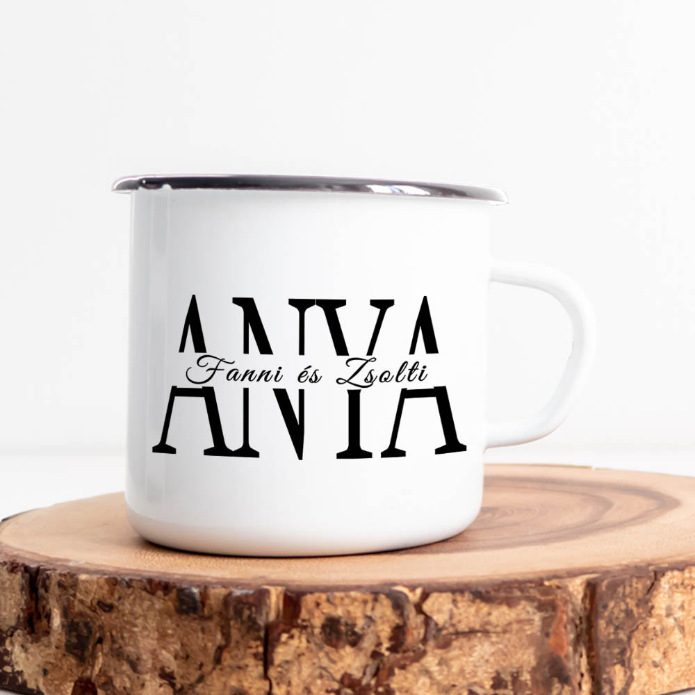 Anyák napi ajándék, gyermekek nevével bögre. Egy kedves ajándék Édesanyáknak anyák napjára, személyre szabható gyerekneves bögre  születésnapra, névnapra is kiváló meglepetés. Gyerekneves bögre többféle színű kerámia vagy zománc, tartós minta akár mosogatógépben is tisztítható.
