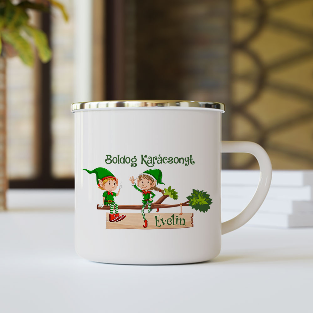 Karácsonyi ajándék, manós bögre. Karácsonyi bögre manós mintával és egyedi, saját névvel. Karácsonyi ajándéknak ideális választás, a család minden tagjának. Többféle színben rendelhető kerémia vagy zománc.