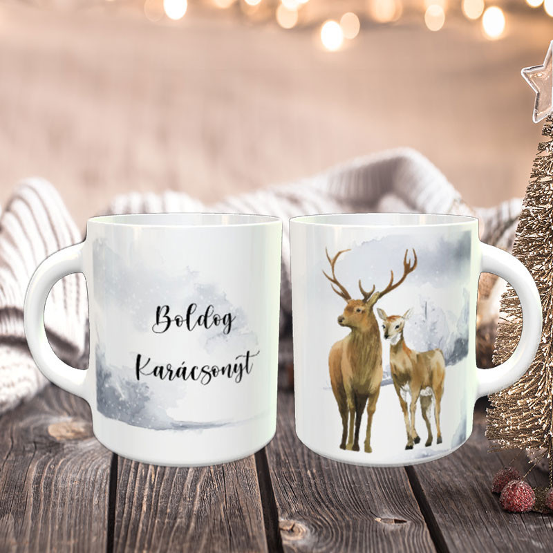 Szarvasos bögre vadásznak. Boldog Karácsony felirat helyett bármilyen más felirat név kérhető. Írd be milyen szöveg kerüljön a bögrére, hogy egyedi, tökéletes legyen az ajándékod. A bögrék anyaga választható: kerámia, vagy fém zománcos. A kerámia bögrék többféle kialakításban elérhetőek akár díszdobozban is.