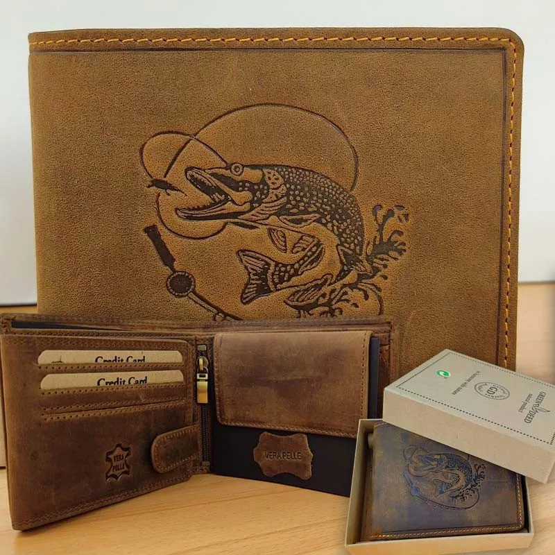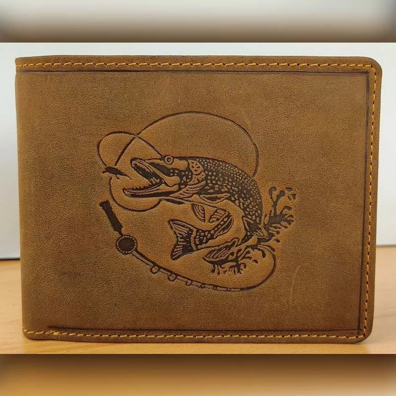 Ajándék horgásznak, pénztárca csuka mintával. Csukamintás horgász pénztárca, tökéletes ajándék minden horgásznak. Praktikus és stílusos választás születésnapra vagy karácsonyra, különösen ragadozóhalak kedvelőinek. Valódi marhabőrből készült, RFID-védelemmel ellátott prémium minőségű termék, 100%-ban természetes bőrből.