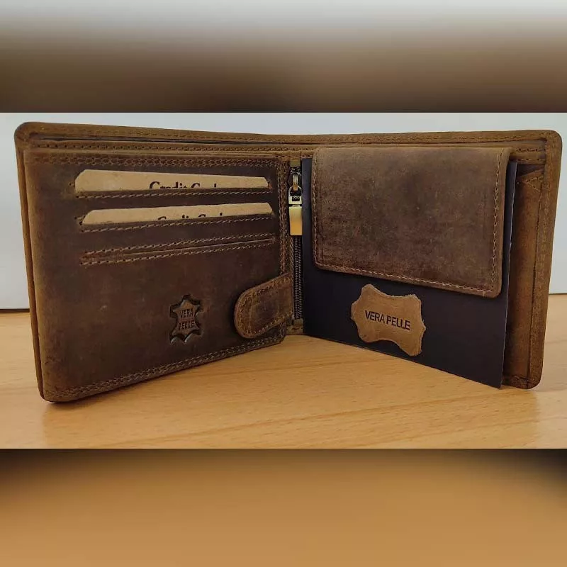 Oldalra lapozható kártya- és igazolványtartó, patentos aprópénztartó, és kétrészes papírpénztartóval rendelkezik. Díszdobozos pénztárca.
