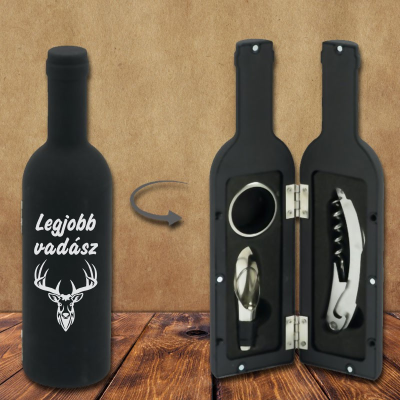 Vadászoknak ajándékötlet, legjobb vadász bornyitó szett. Egy borosüveg alakú műanyag ajándékdoboz, mely magában rejt egy-egy darab dugóhúzót, cseppfogót és kiöntőt. Kiváló meglepetés névnapra, születésnapra egy olyan vadásznak akinek a kedvenc itala a bor.