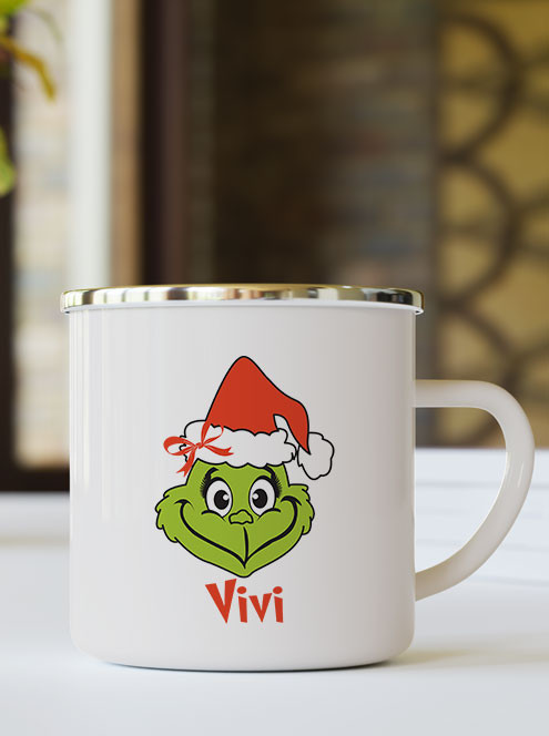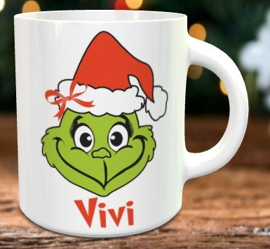 Karácsonyi bögre szett, Grincs kislány. Karácsonyi családi bögre szetthez külön rendelhető kislány grincs bögre szeretet ünnepére gyerekeknek humoros grincs figurával. Népszerű Grinch figurás bögre az egész családnak névre szólóan. Rendelhető akár kerámia vagy zománc bögrére is.