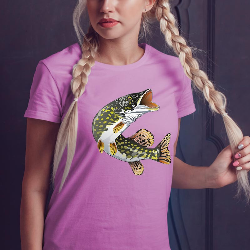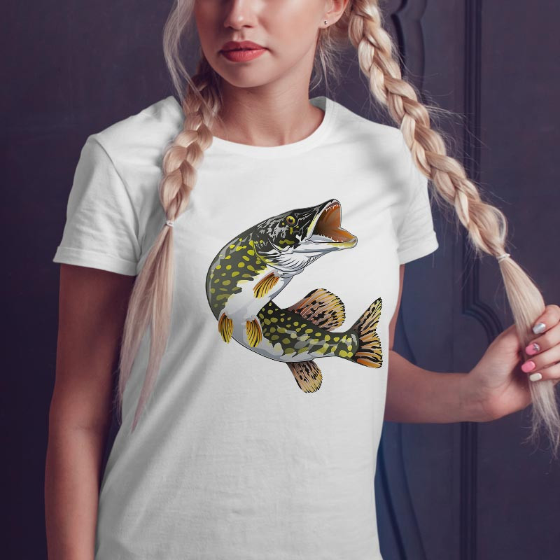 Halas pólók, csuka mintás női póló. A horgászok közül is a legjobb csuka fogó technikával rendelkezőknek ajánljuk ezt a pólót ha ismersz ilyen pecást és éppen neki keresel ajándékot, egy ilyen női póló teli találat lesz nála, hiszen többféle színben is rendelhető és a vízparton is bátran magán viselheti.