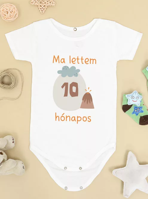 Már csak két hónap a nagy szülinapig! Ünnepeljétek a 10. hónapot ezzel az édes dinoszauruszos bodyval, amely egyedi ajándékként is megállja a helyét. A „Ma lettem 10 hónapos” felirat garantáltan mosolyt csal mindenki arcára. A body fehér színű, rövid ujjú, patentos, és 100% pamutból készült – tökéletes választás akár egész napos viselésre is.