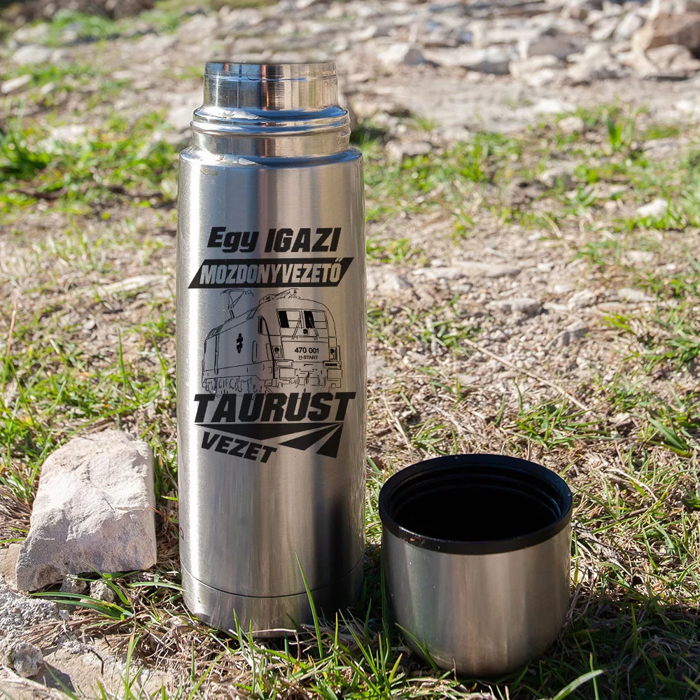 Termosz mozdonyvezetőknek, TAURUS termosz. Egy igazi mozdonyvezető TAURUST vezet termosz mozdonyvezetőknek, ajándék masinisztáknak.