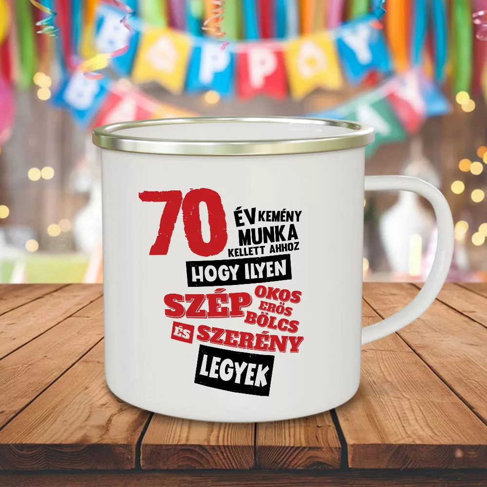 Vicces szülinapi bögre, választható életkorral. Ez a születésnapi bögre választható életkorral tökéletes választás, ha vicces, mégis személyes ajándékot keresel. A mintán szereplő „... év kemény munka kellett ahhoz, hogy ilyen szép, okos, erős, bölcs és szerény legyek” felirat garantáltan mosolyt csal az ünnepelt arcára, ráadásul bármilyen életkorral kérhető, így könnyen az adott születésnaphoz igazítható.