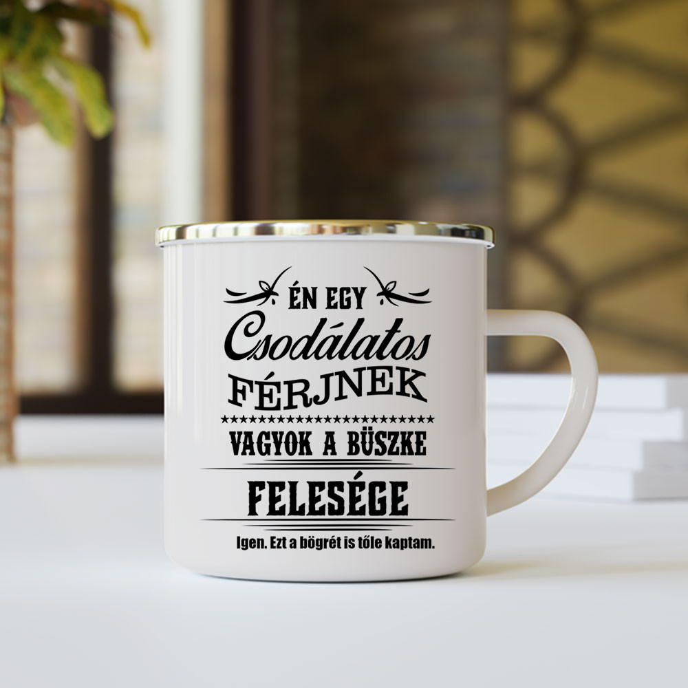 Bögre feleségnek, büszke feleség. Én egy csodálatos férjnek vagyok a büszke felesége feliratos bögre, rendelj egy ilyen bögrét ha szeretnéd, hogy tudja a férjed mennyire büszke is vagy rá. Rendeld díszdobozban, ha szeretnéd vele meglepni Őt.