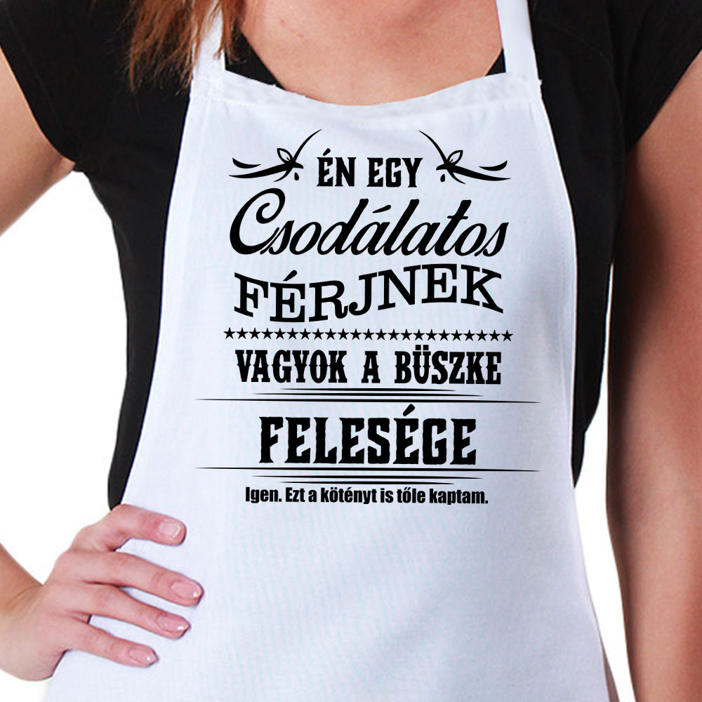 Kötény feleségnek, büszke feleség. Én egy csodálatos férjnek vagyok a büszke felesége feliratos kötény, rendelj egy ilyen kötényt ha szeretnéd, hogy tudja a férjed mennyire büszke is vagy rá. A kötény fekete színben is rendelhető, ebben az esetben a fekete felirat fehér színű lesz. Anyaga vászon.