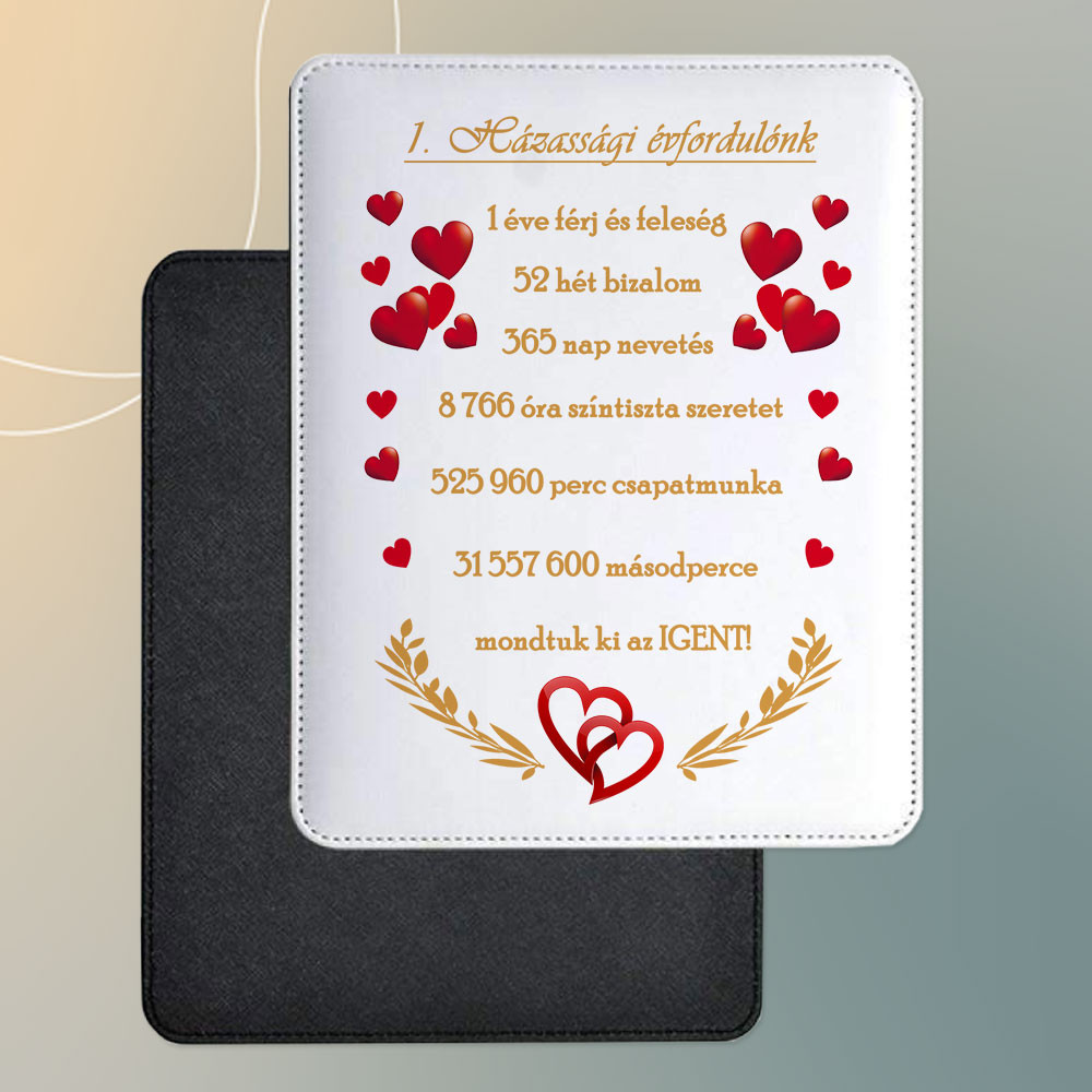 Ajándék házassági évfordulóra, feliratos egérpad. Tökéletes évfordulós ajándék férjnek és feleségnek, bármely évszámmal rendelhető! Ez az egyedi egérpad romantikus és személyre szabható meglepetés pároknak, amely tökéletes választás házassági évfordulóra. A egérpad látványos grafikával és szöveggel örökíti meg a közös évek fontos pillanatait. Neked nincs más dolgod, mint megadni hanyadik évfordulóra lesz, a többit mi kiszámoljuk!