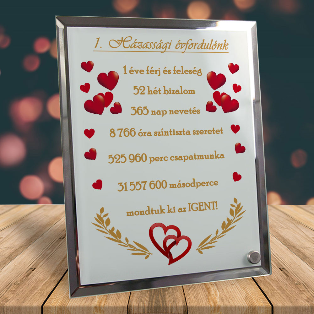 Ajándék házassági évfordulóra, feliratos fotóüveg. Tökéletes évfordulós ajándék férjnek és feleségnek, bármely évszámmal rendelhető! Ez az egyedi dekorációs fotóüveg romantikus és személyre szabható meglepetés pároknak, amely tökéletes választás házassági évfordulóra. A fotóüveg látványos grafikával és szöveggel örökíti meg a közös évek fontos pillanatait. Neked nincs más dolgod, mint megadni hanyadik évfordulóra lesz, a többit mi kiszámoljuk!