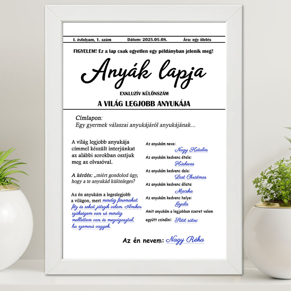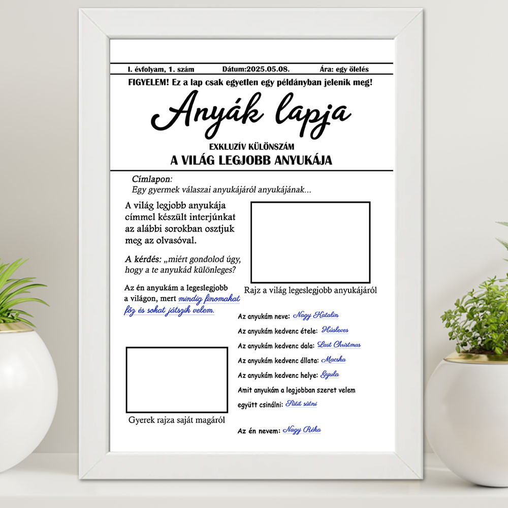 Ajándék Édesanyáknak, Anyák lapja falikép A3. Egy lap, amely kettőtökről szól. Újságcímlap stílusú A3 méretű falikép, amely kizárólag a világ legjobb anyukájának készült – egyetlen, személyre szabott példányban. Ez a kreatív ajándék lehetőséget ad arra, hogy a gyermek saját szavaival mondja el, miért ő a legjobb anya a világon. Illetve választható rajzos verzió is, amennyiben a kisgyermek szeretné lerajzolni magát és Édesanyját, ebben az esetben a keretből könnyen kivehető a nyomtatott lap és a rajz elkészülte után oda visszahelyezhető. Ennél egyedibb ajándékot garantáltan nem találsz máshol!