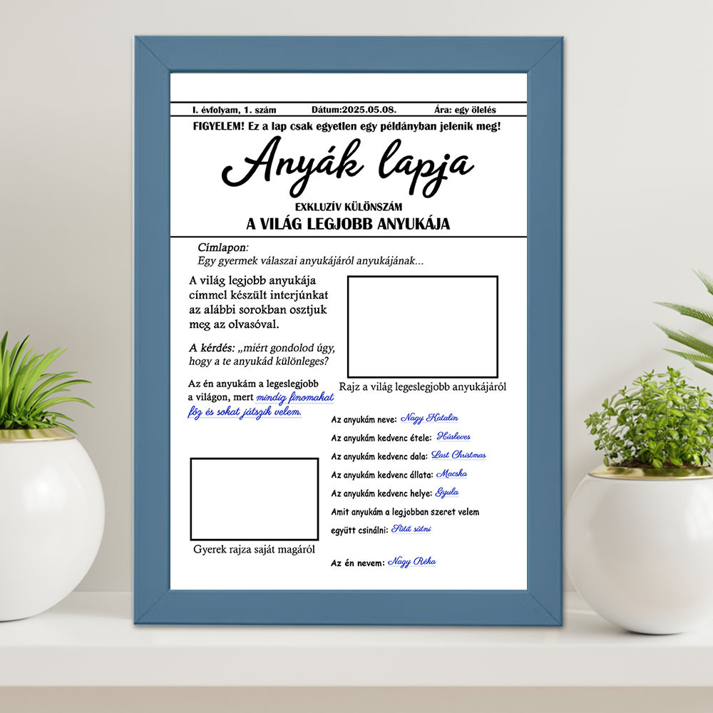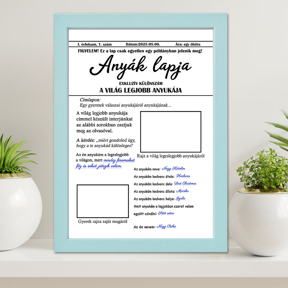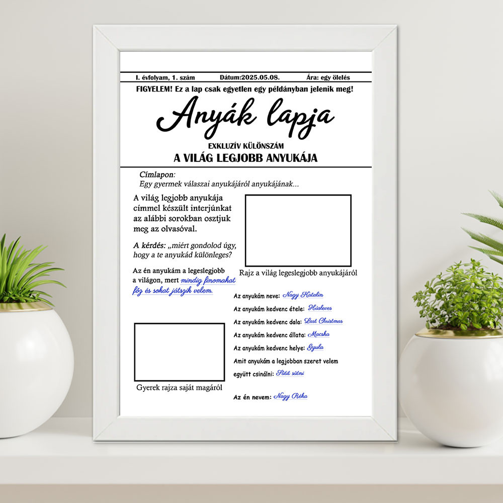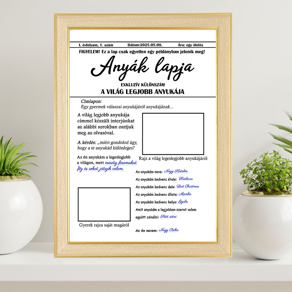 Ajándék Édesanyáknak, Anyák lapja falikép A4. Egy lap, amely kettőtökről szól. Újságcímlap stílusú A4 méretű falikép, amely kizárólag a világ legjobb anyukájának készült – egyetlen, személyre szabott példányban. Ez a kreatív ajándék lehetőséget ad arra, hogy a gyermek saját szavaival mondja el, miért ő a legjobb anya a világon. Illetve választható rajzos verzió is, amennyiben a kisgyermek szeretné lerajzolni magát és Édesanyját, ebben az esetben a keretből könnyen kivehető a nyomtatott lap és a rajz elkészülte után oda visszahelyezhető. Ennél egyedibb ajándékot garantáltan nem találsz máshol!