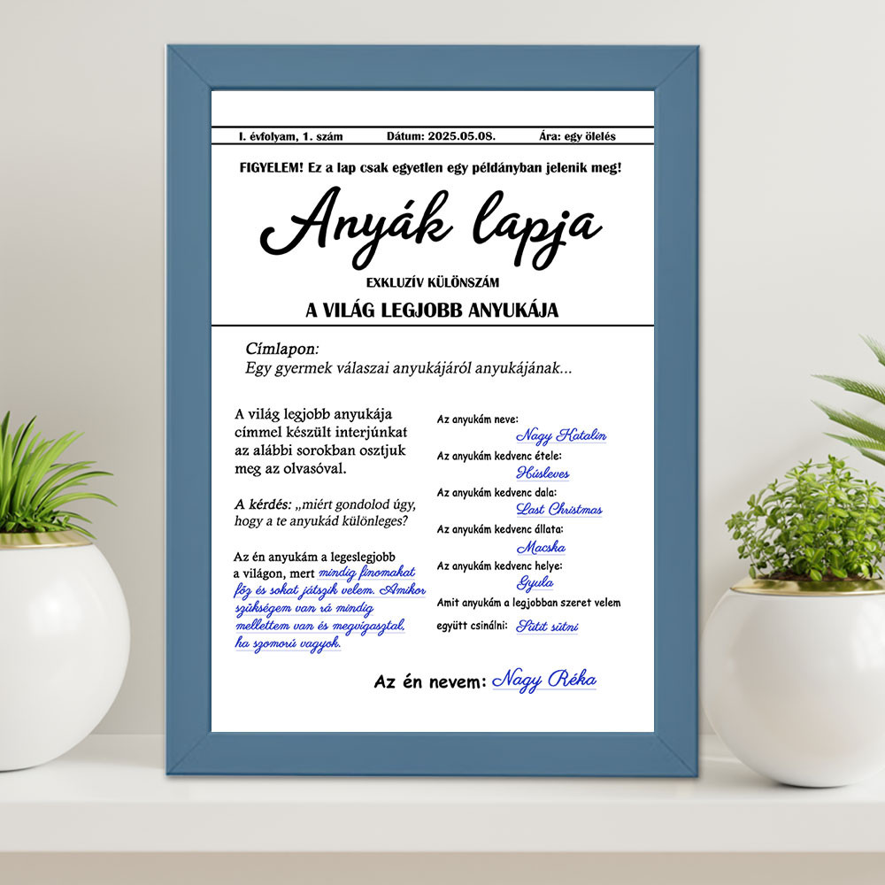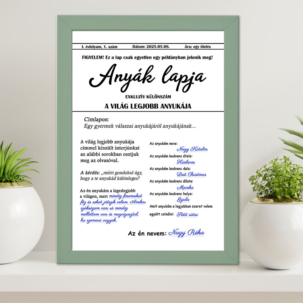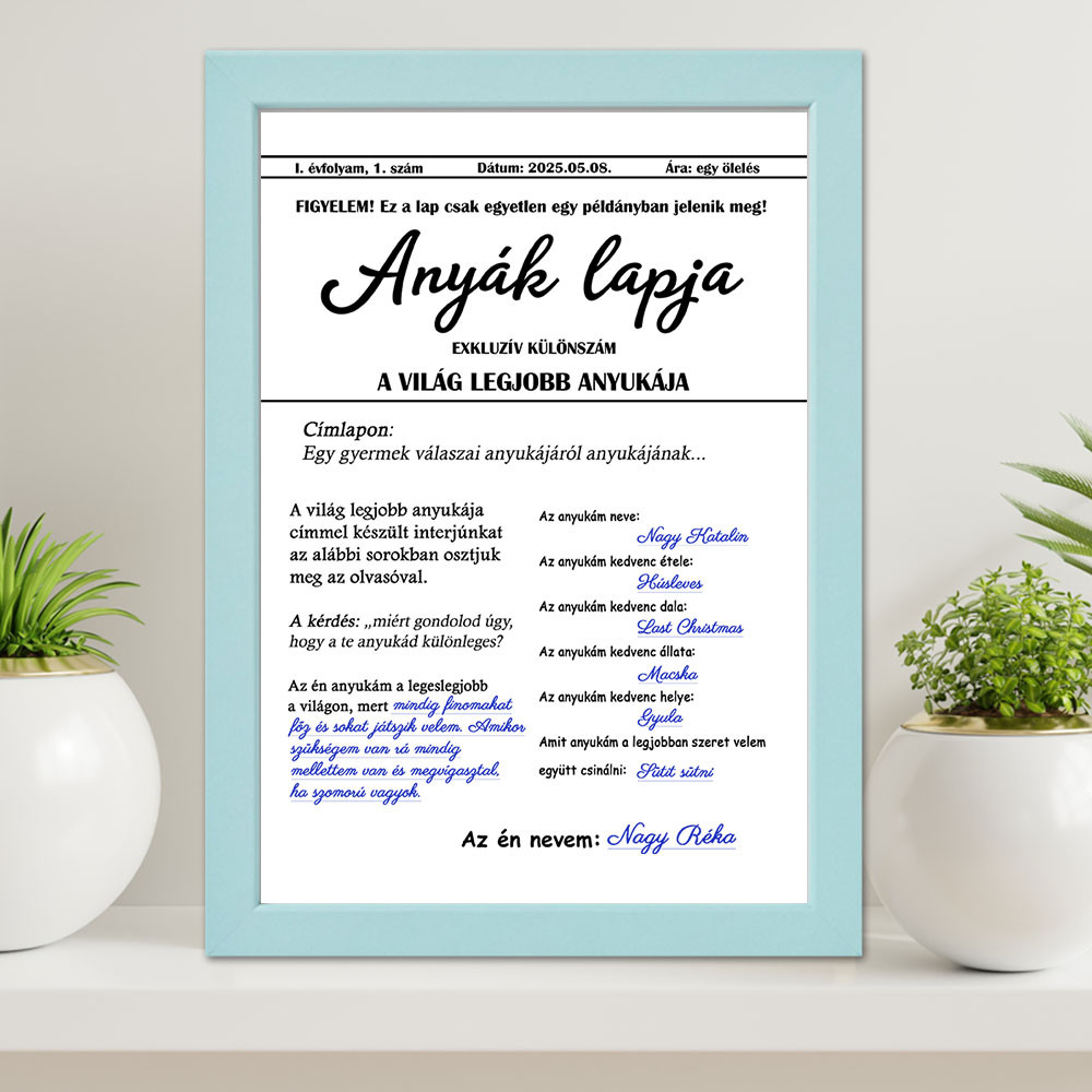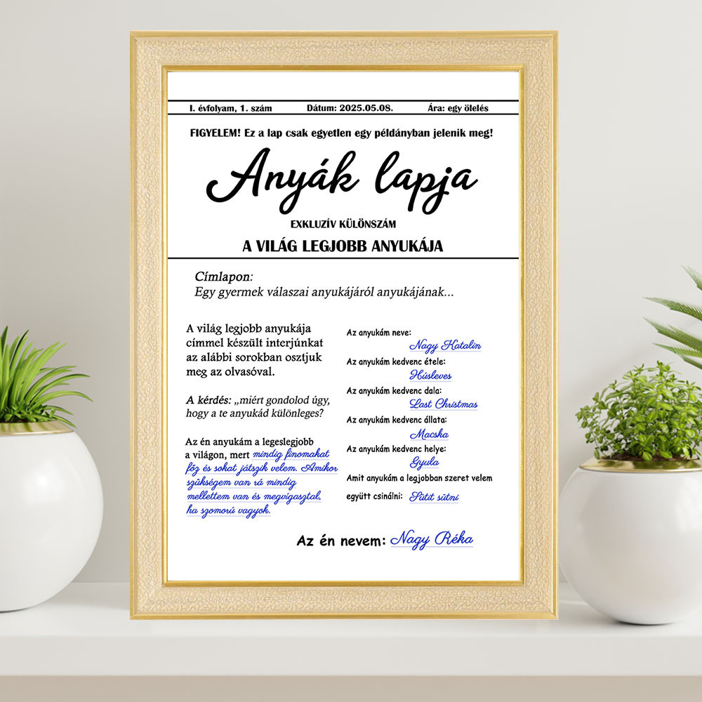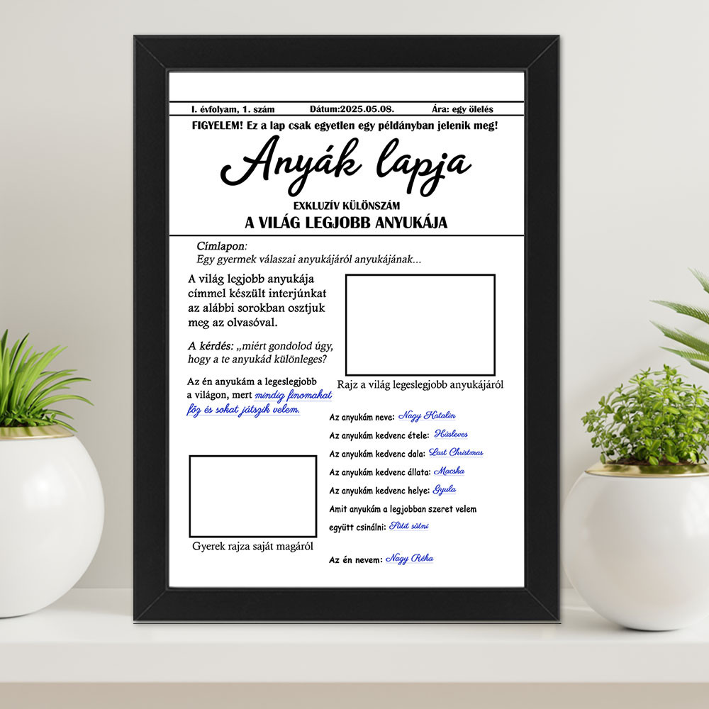 Ajándék Édesanyáknak, Anyák lapja falikép A4. Egy lap, amely kettőtökről szól. Újságcímlap stílusú A4 méretű falikép, amely kizárólag a világ legjobb anyukájának készült – egyetlen, személyre szabott példányban. Ez a kreatív ajándék lehetőséget ad arra, hogy a gyermek saját szavaival mondja el, miért ő a legjobb anya a világon. Illetve választható rajzos verzió is, amennyiben a kisgyermek szeretné lerajzolni magát és Édesanyját, ebben az esetben a keretből könnyen kivehető a nyomtatott lap és a rajz elkészülte után oda visszahelyezhető. Ennél egyedibb ajándékot garantáltan nem találsz máshol!