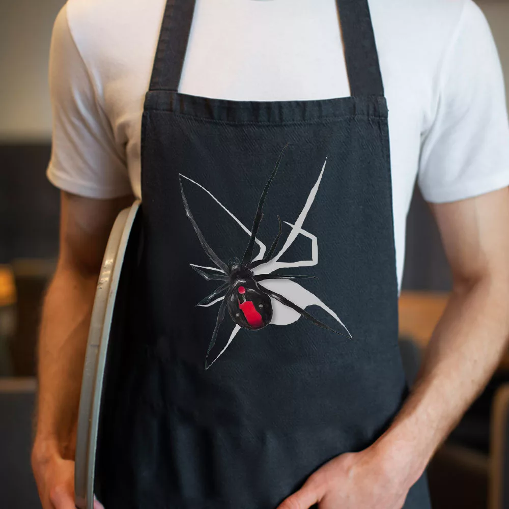 Vicces ajándék, pókos kötény. Fekete özvegy mintával ellátott kötény, pókmániás barátodnak, családtagodnak. Bármilyen alkalomra jó meglepetés lehet egy olyan ismerősödnek, aki szereti a pókokat vagy vicces ajándék olyannak, aki fél tőlük.
