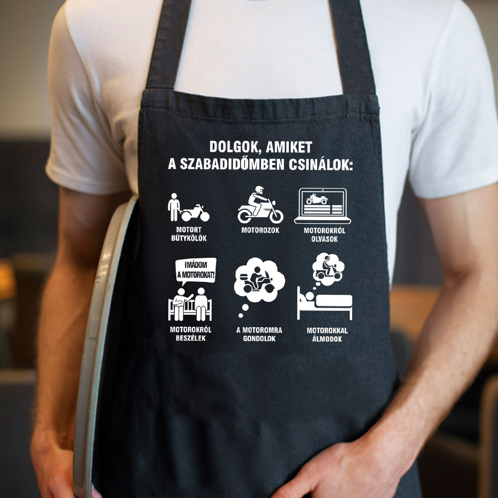 Vicces motoros kötény, motorosok szabadideje. Humoros ajándék férfiaknak és nőknek, akiknek mindenük a motorok, imádják a sebességet és a száguldást vagy csak szeretnek vezetni, esetleg hobbijuk az motorszerelés. Tökéletes ajándék a motorok megszállottjainak. Lepd meg barátod, rokonod egy köténnyel fekete vagy fehér színben.