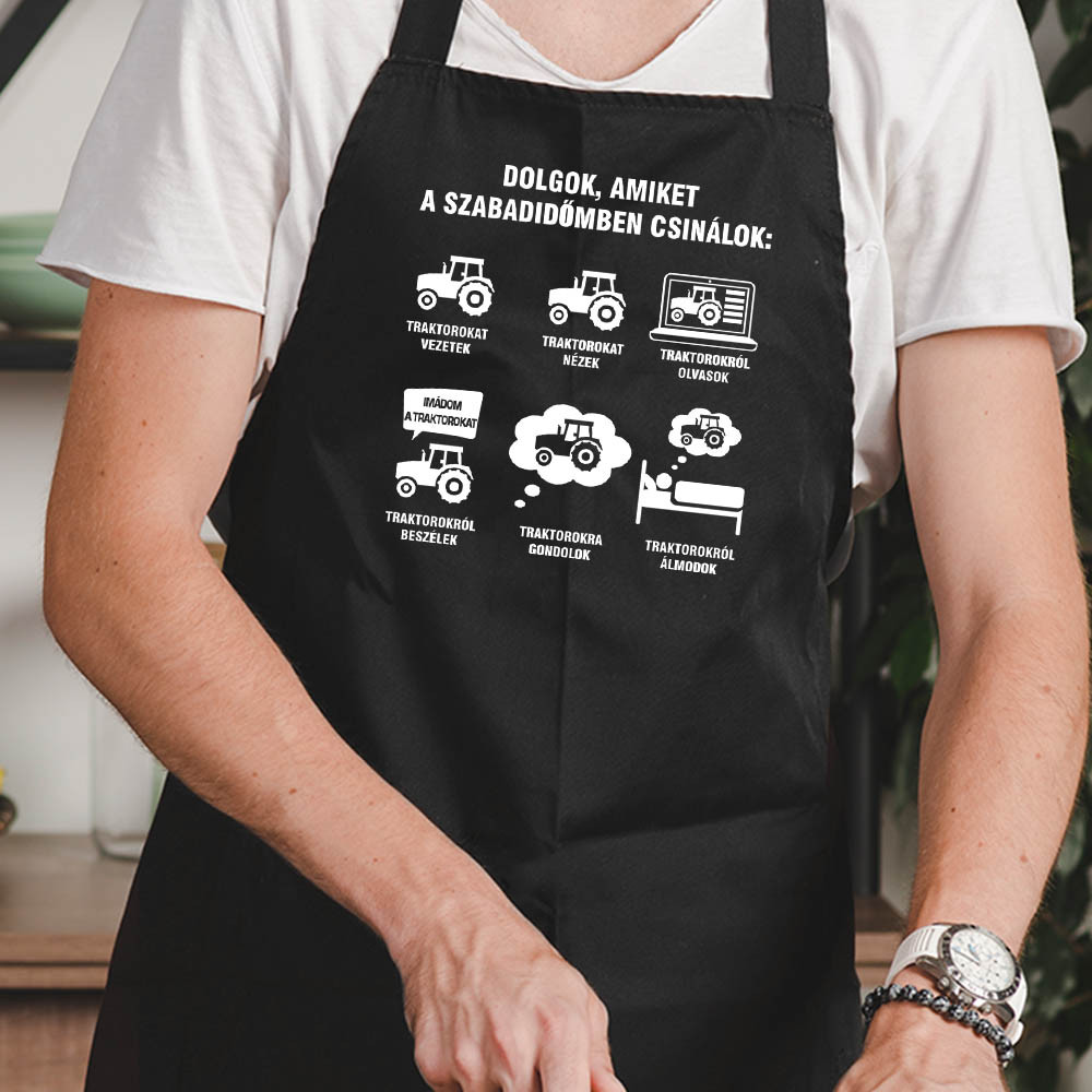 Kötény traktorosnak, traktorosok szabadideje. Humoros kötény feliratokkal, amik egy igazi traktoros életét mutatják. Ha tudod, hogy rokonod, barátod szabadidejét is a traktoroknak szenteli, ajándékozd meg születésnapján, karácsonykor egy ilyen köténnyel.