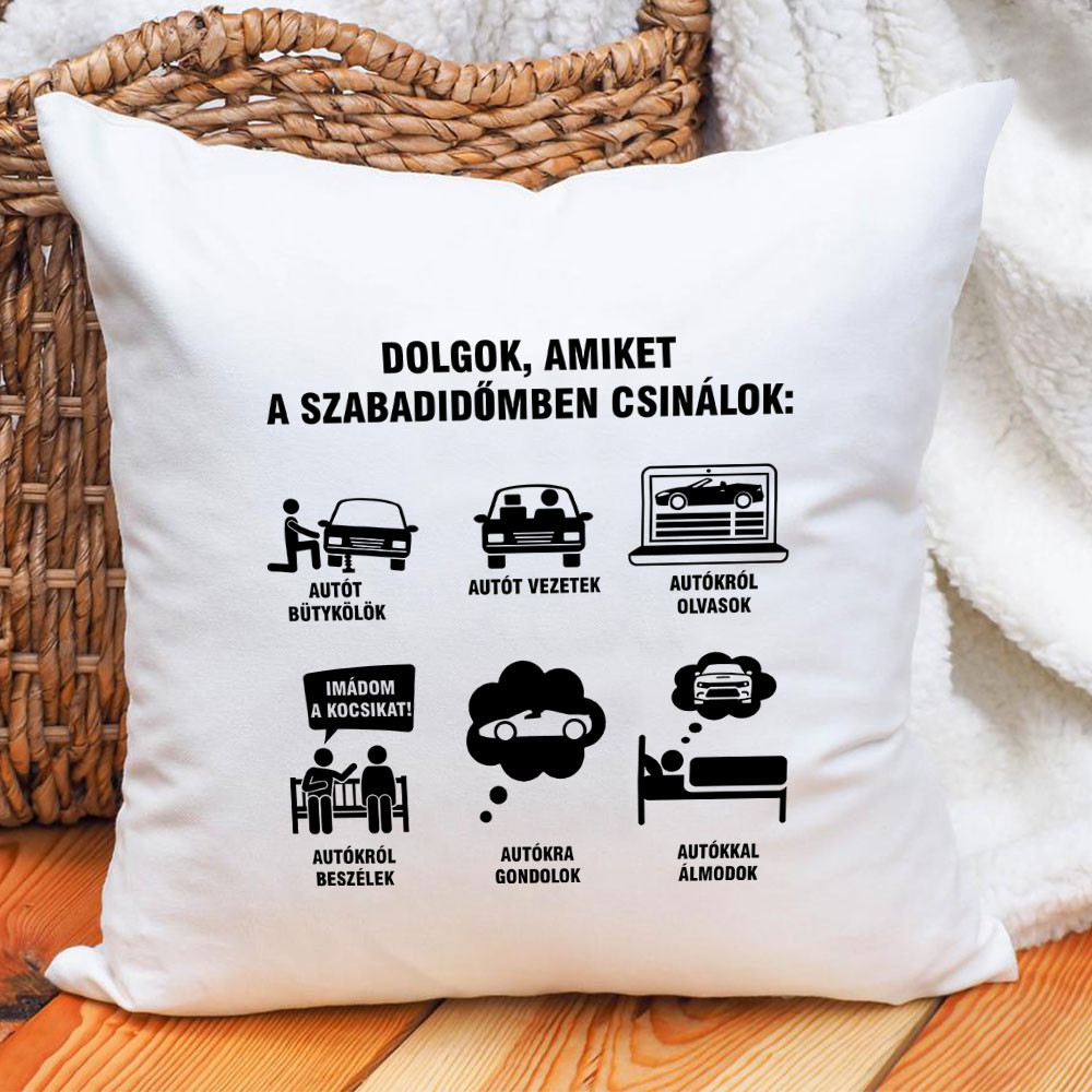 Vicces párna autósoknak, autósok szabadideje. Humoros párna férfiaknak és nőknek, akiknek mindenük a kocsik, imádják a sebességet és a száguldást vagy csak szeretnek vezetni, esetleg hobbijuk az autószerelés. Tökéletes ajándék a autók megszállottjainak. Lepd meg családtagod, barátod párnával nagy színválasztékól válaszd ki a neked tetszőt.