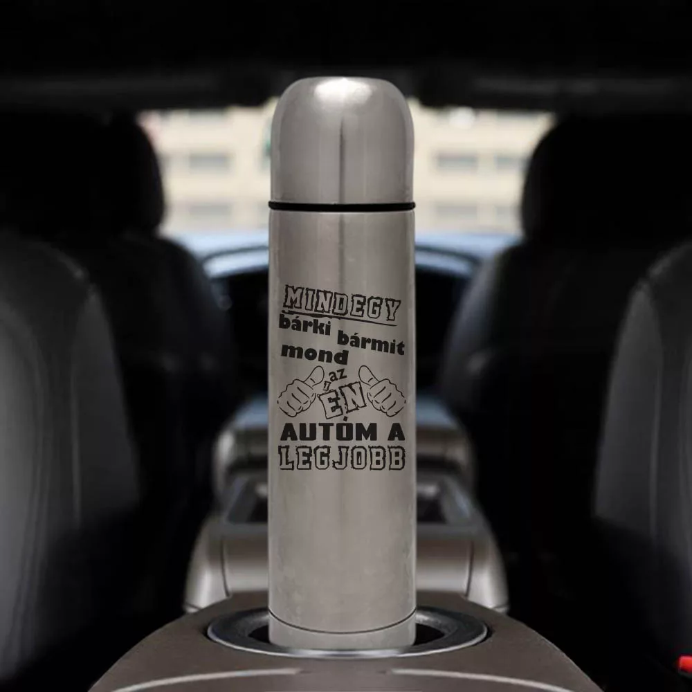 Autós termoszok, én autóm a legjobb. Mindegy bárki bármit mond, az én autóm a legjobb feliratos termosz, olyan sofőrnek aki csakis a saját autójára esküszik és nem cserélné le semmire sem. Rendelj ajándékot születésnapra, névnapra egy büszke autó tulajdonosnak. Anyaga rozsda mentes acél és műanyag, 500ml-es és 750ml-es változatban elérhetőek.