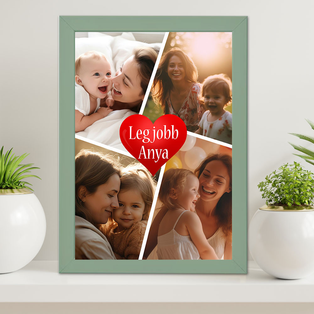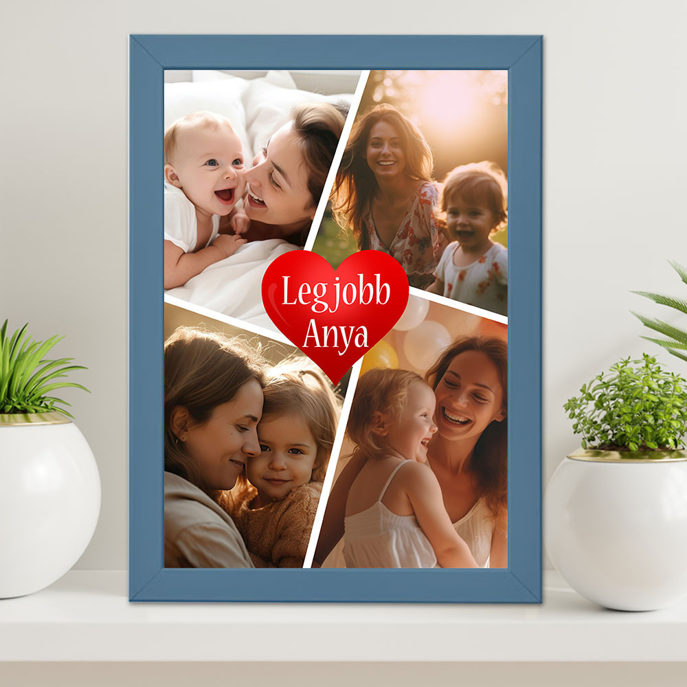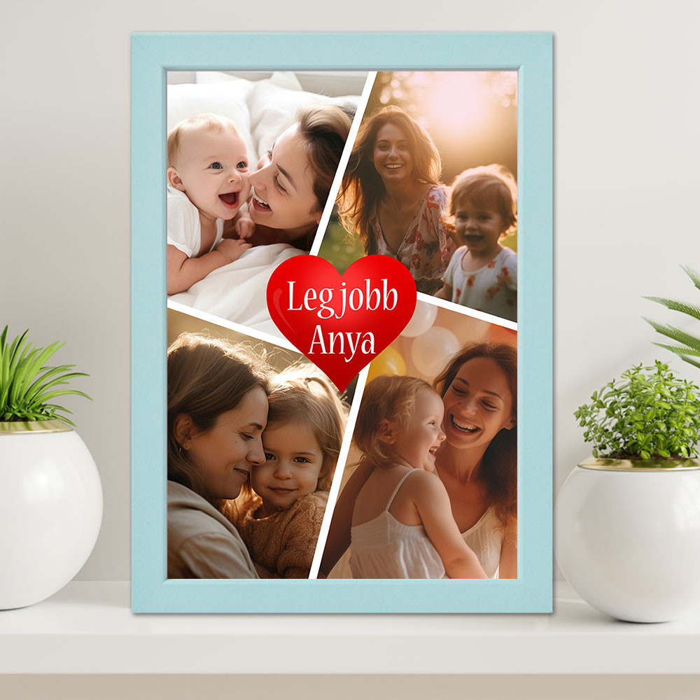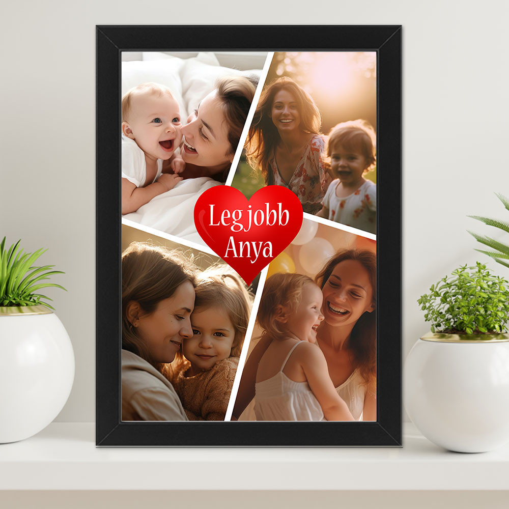 Falikép kollázs fotókkal, legjobb anya. Kollázs fényképes A4 méretű falikép a legjobb Édesanyának. Különleges ajándék Édesanyád születésnapjára, anyák napjára vagy karácsonyra. Egy meglepetés amiről bármikor eszébe jutsz, ha ránéz. Falikép, melyen egy 4 fotóból álló kollázs fotóösszeállítás látható a Te kedvenc képeidből