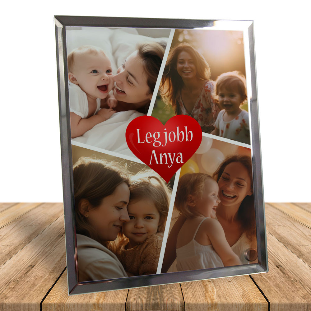Fotóüveg kollázs fotókkal, legjobb anya. Fényképes meglepetés a legjobb Édesanyának. Különleges ajándék Édesanyád születésnapjára, anyák napjára vagy karácsonyra. Egy meglepetés amiről bármikor eszébe jutsz, ha ránéz. Fotóüveg, melyen egy 4 fotóból álló kollázs fotóösszeállítás látható a Te kedvenc képeidből