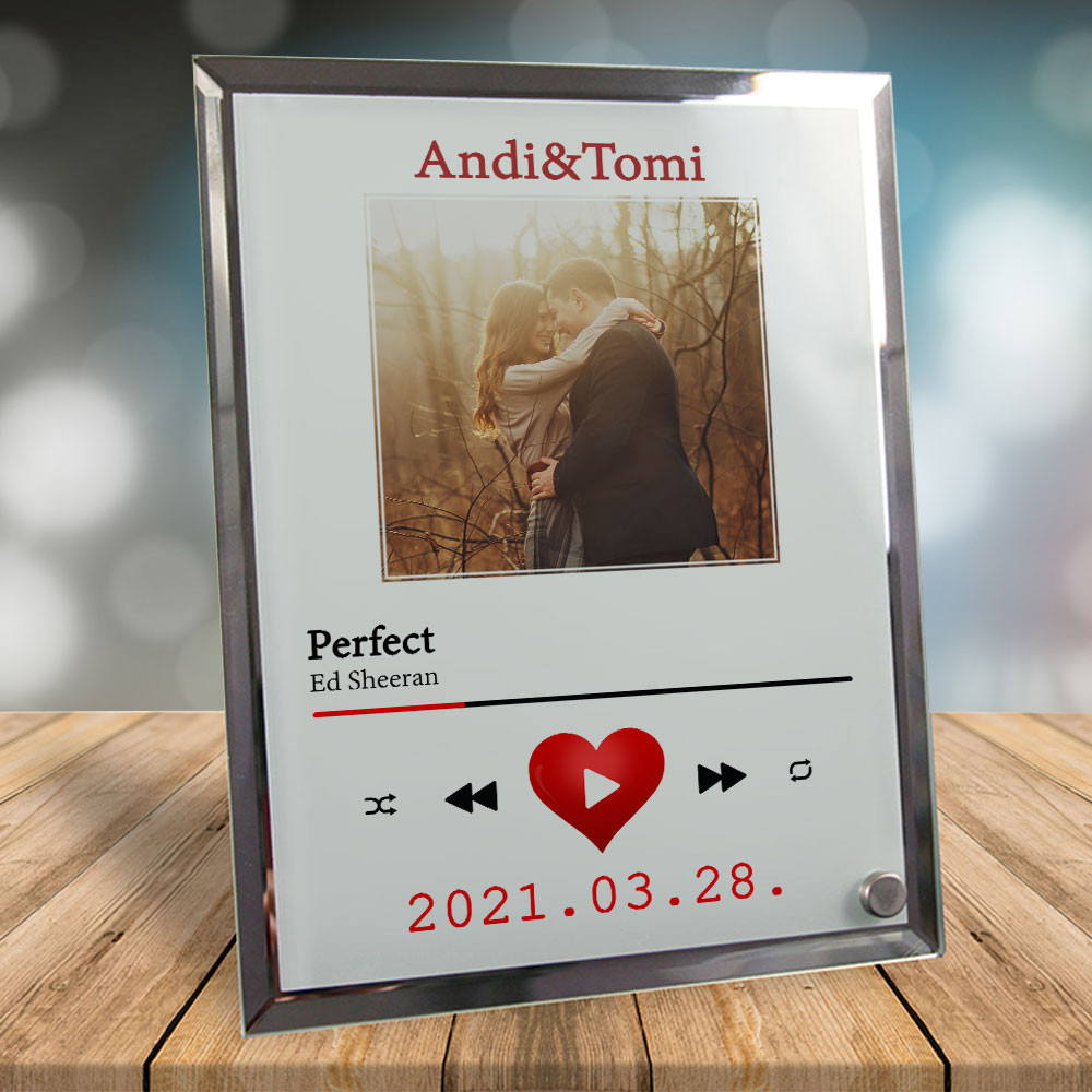 Szerelmes ajándék, közös dal fotóüveg. Valentin napi, évfordulós ajándék barátodnak, barátnődnek, házasoknak. Lepd meg férjed, feleséged akár karácsonyra is egy különleges fotóüveggel, ami egy képeteket ábrázolja egy zenelejátszóban ahol a közös zenétek megy.