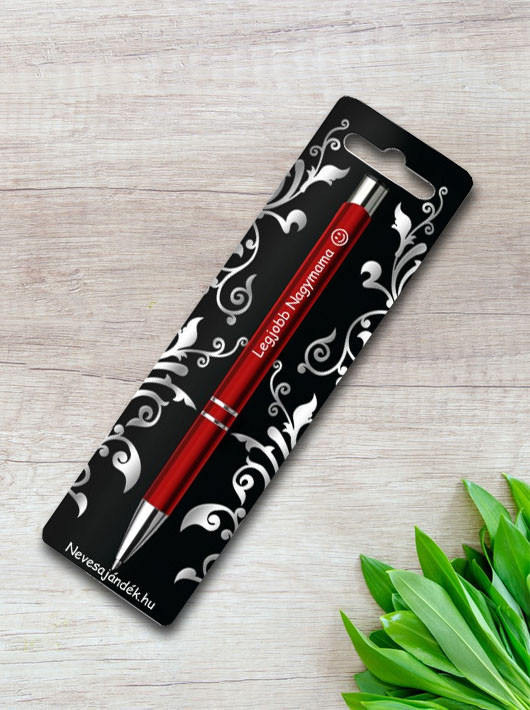 Piros gravírozott toll Legjobb Nagymama felirattal. A golyóstoll tintája kék, szépen fog, nem túl vastag és nem túl vékony írásképet ad. Hosszúsága 13,6 cm. Különleges és igényes ajándék nőknek, nagymamáknak és tökéletes anyák napi ajándék is.