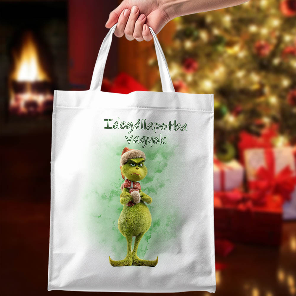 Ez a „Idegállapotba vagyok” Grincs vászontáska tökéletes társ a karácsonyi bevásárláshoz – elfér benne minden ajándék és egy adag türelem is!