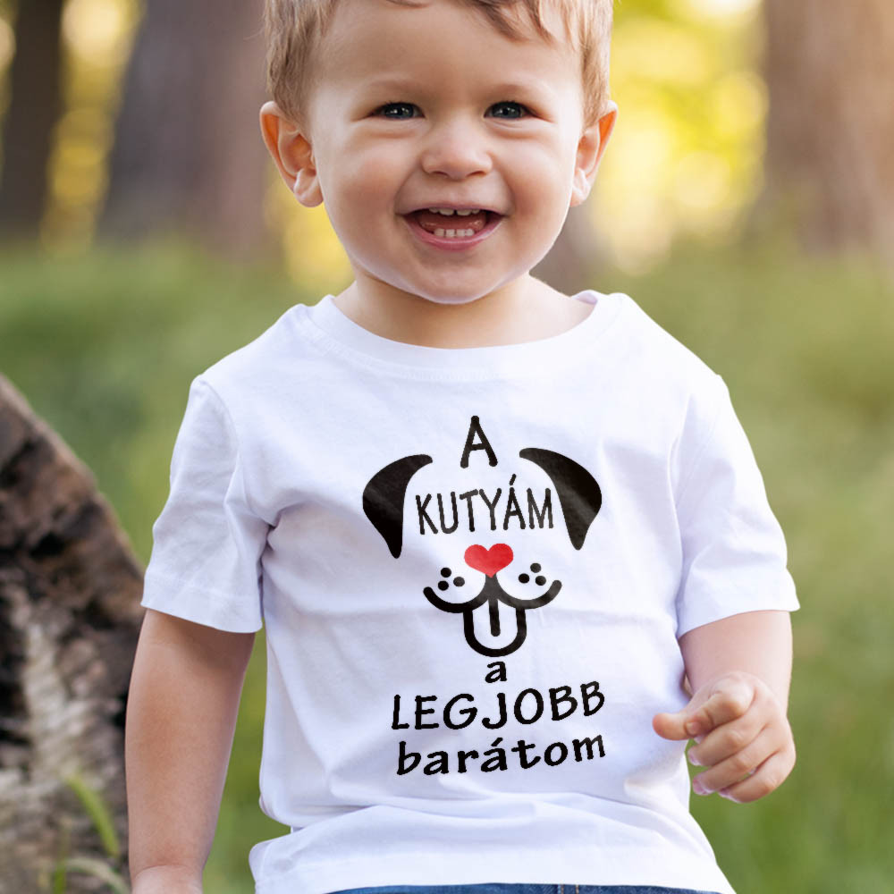Kutyás ajándék, legjobb barátom gyerek póló. A kutyám a legjobb barátom feliratos gyerek póló, igazi meglepetés egy olyan gyereknek, akinek a kutyája is családtagnak számít. Legjobb szülinapi ajándék minden állatbarát gyereknek.
