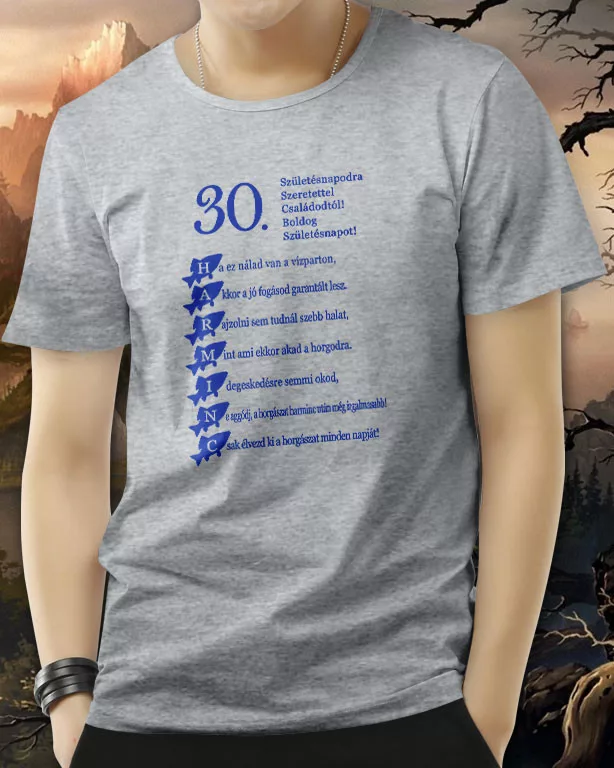 Ajándék horgászoknak, 30. születésnapra póló. Szülinapi jókívánságokkal ellátott póló kizárólag horgászoknak. Ha van neked is olyan ismerősöd aki most ünnepli a 30. születésnapját és szabadidejében ha teheti pecázik, lepd meg ezzel a feliratos pólóval, ami garantáltan nem lesz másnak a vízparton. Most akciós áron 1 darab van készleten.