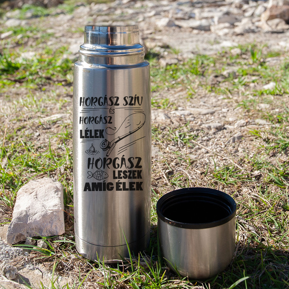 Ajándék horgásznak, horgász szív termosz. Praktikus ajándék horgásznak.  Feliratos termosz.  "Horgász szív és horgász lélek, horgász leszek amíg élek" felirattal ellátott ajándék termosz. Lepd meg horgászni imádó párodat, családtagodat egy termosszal. Születésnapra, névnapra vagy akár karácsonyi ajándéknak is ideális választás lehet. Űrtartalma: 500ml-es vagy 750ml-es.