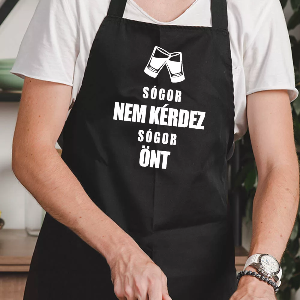 Vicces kötény férfiaknak, sógor önt. "Sógor nem kérdez, sógor önt". Ajánljuk ajándékba, vagy családi közös főzések kiváló hangulatfokozó kelléke. Fekete színben is rendelhető. A kötény anyaga vászon.