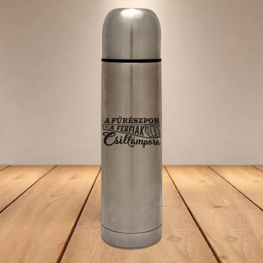 Termosz asztalosoknak, a fűrészpor a férfiak csillámpora. Vicces feliratos termosz férfiaknak, kiváló ajándékötlet lehet faiparban dolgozó családtagodnak, barátaidnak. "A fűrészpor a férfiak csillámpora" felirattal.