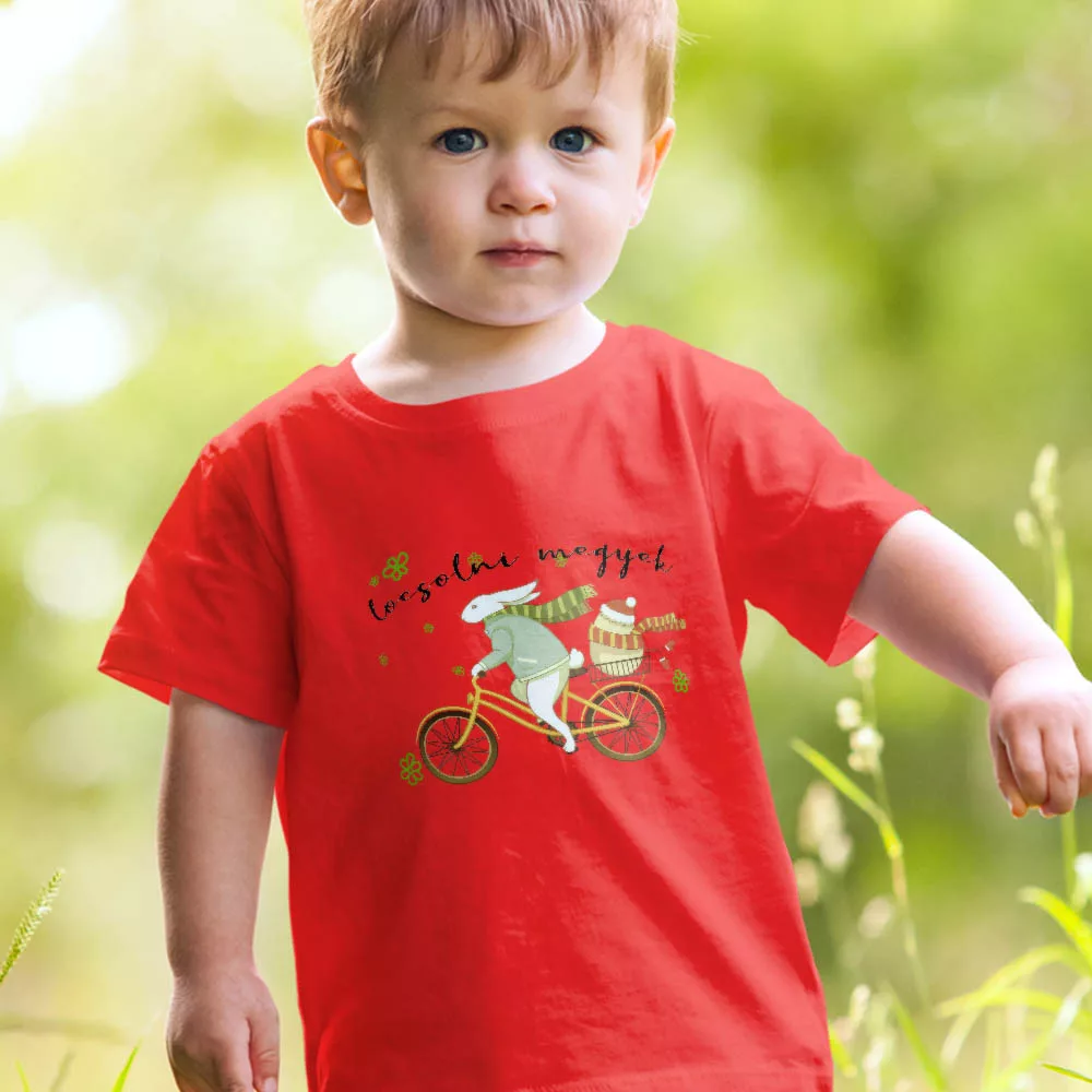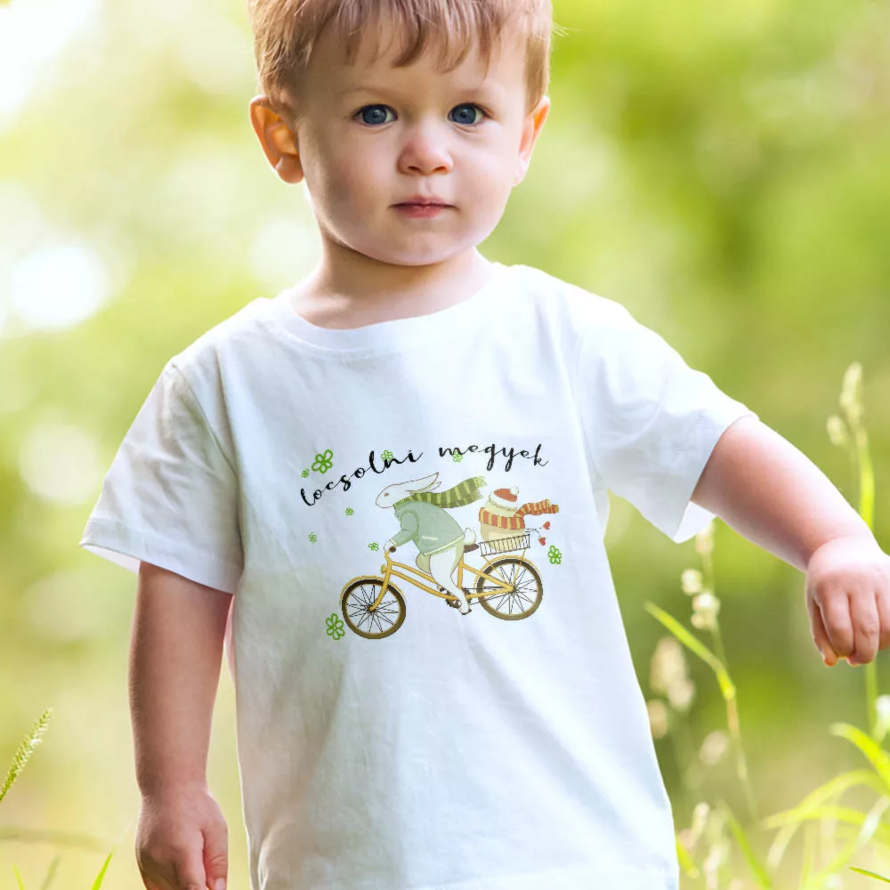 Gyerek póló húsvétra, locsolni megyek. Egyedi gyerek póló a húsvéti locsolkodáshoz, locsolni megyek felirattal és biciklis nyúl mintával. Vásárolj felnőtt és gyerek méretben is, hogy összeöltözhess gyermekeddel.